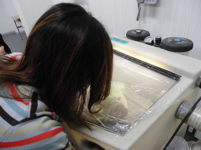サンドブラストガラス彫刻(ガラスに圧縮空気で砂を吹付けて磨りガラス状に模様をつける)